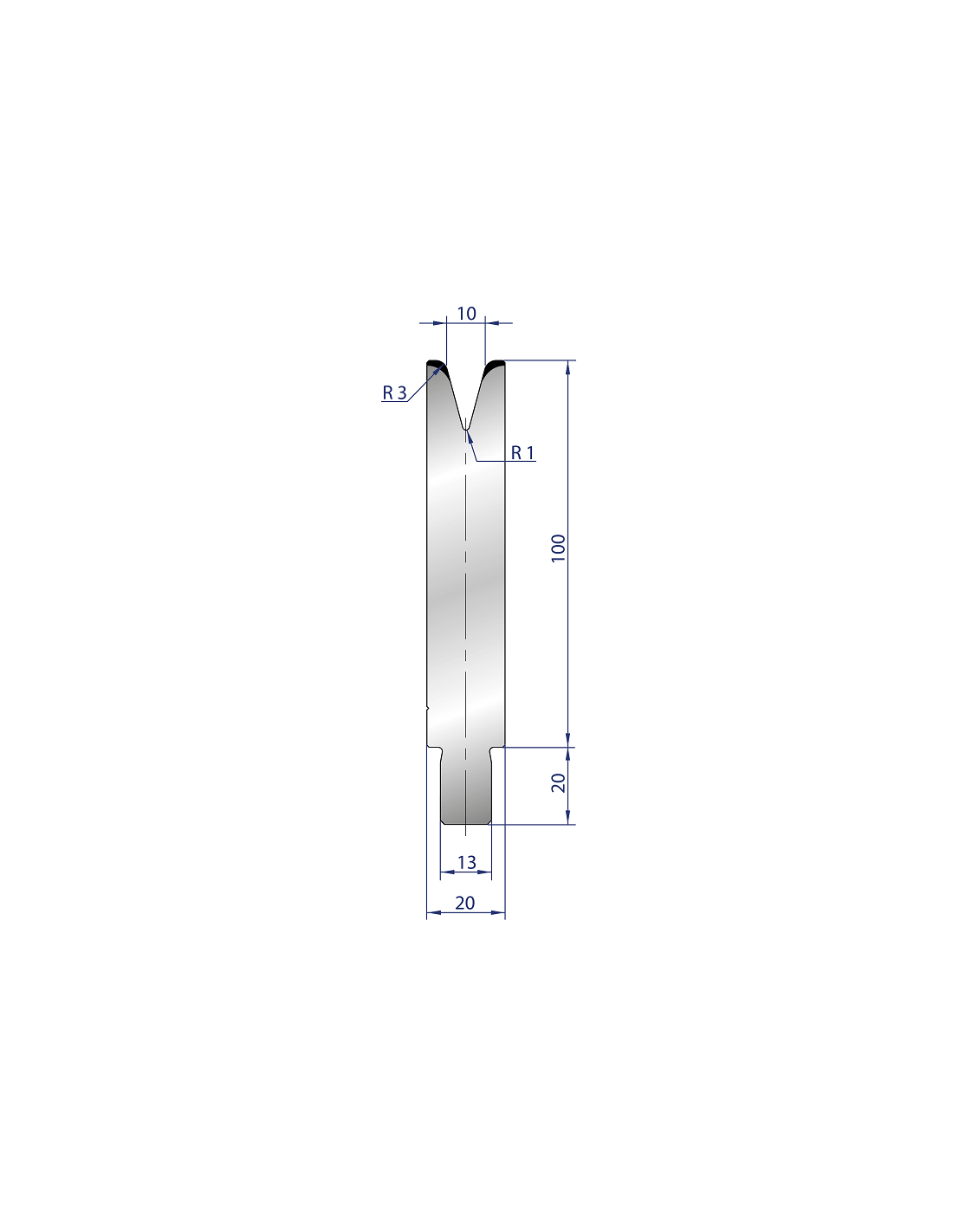 Produktyp: 1V dyna Vinkel (°): 30° Höjd (mm): 100 Dynspår: 10 Material: 42CrMo4 Max T/m = 30 Radie: 3 Fabrikat: Trumpf